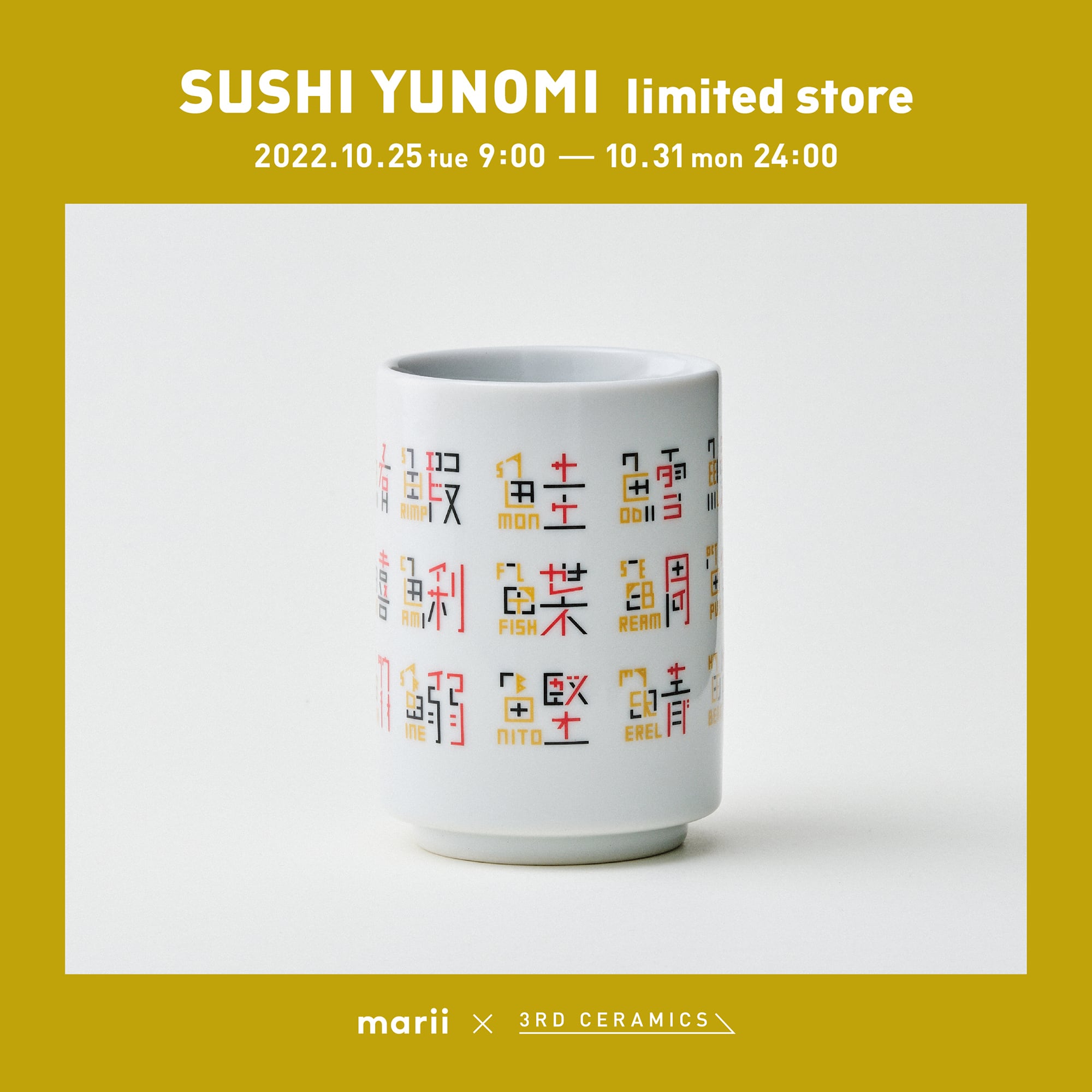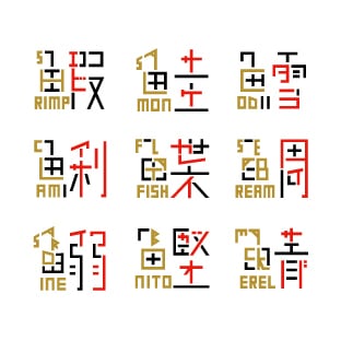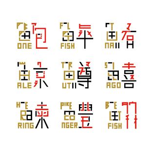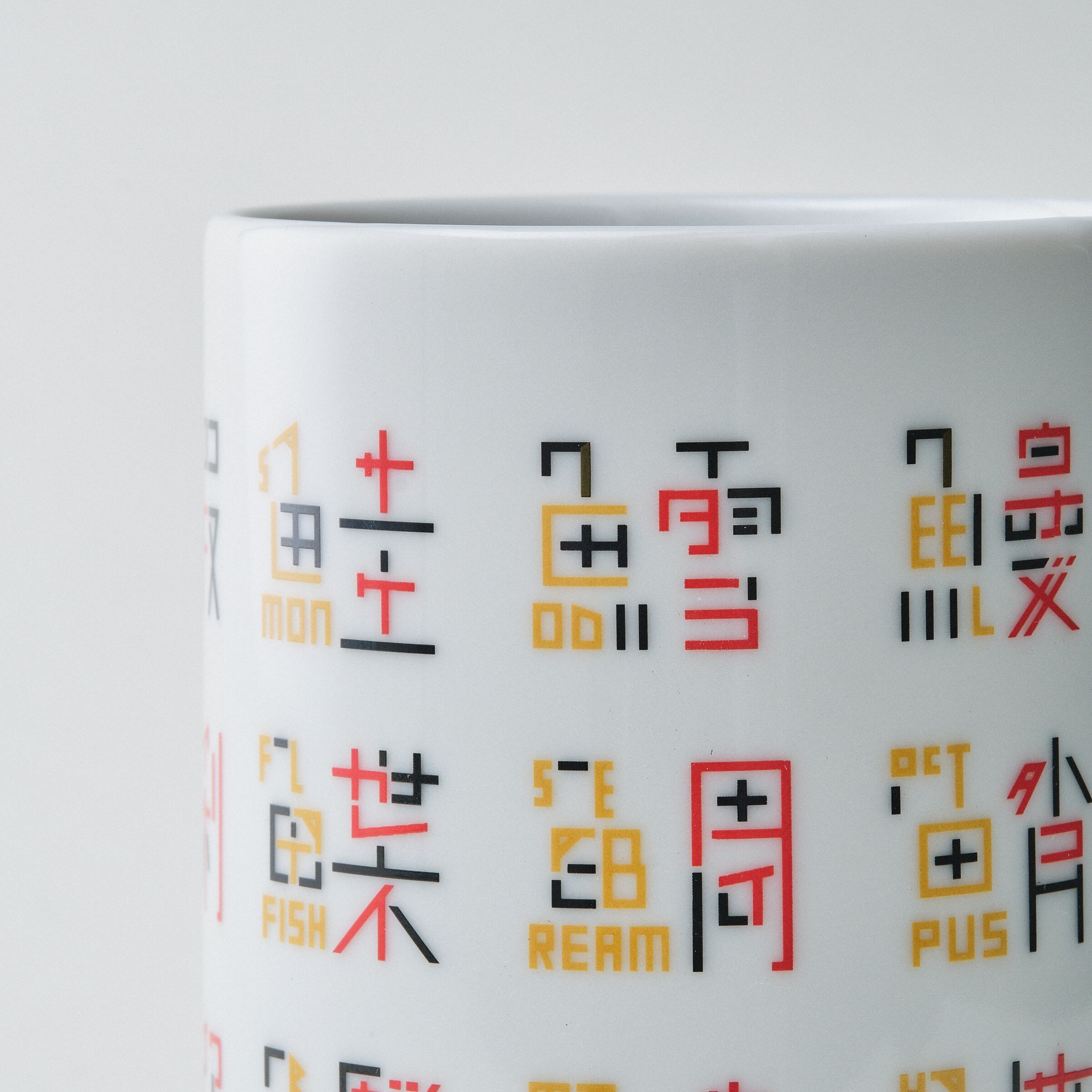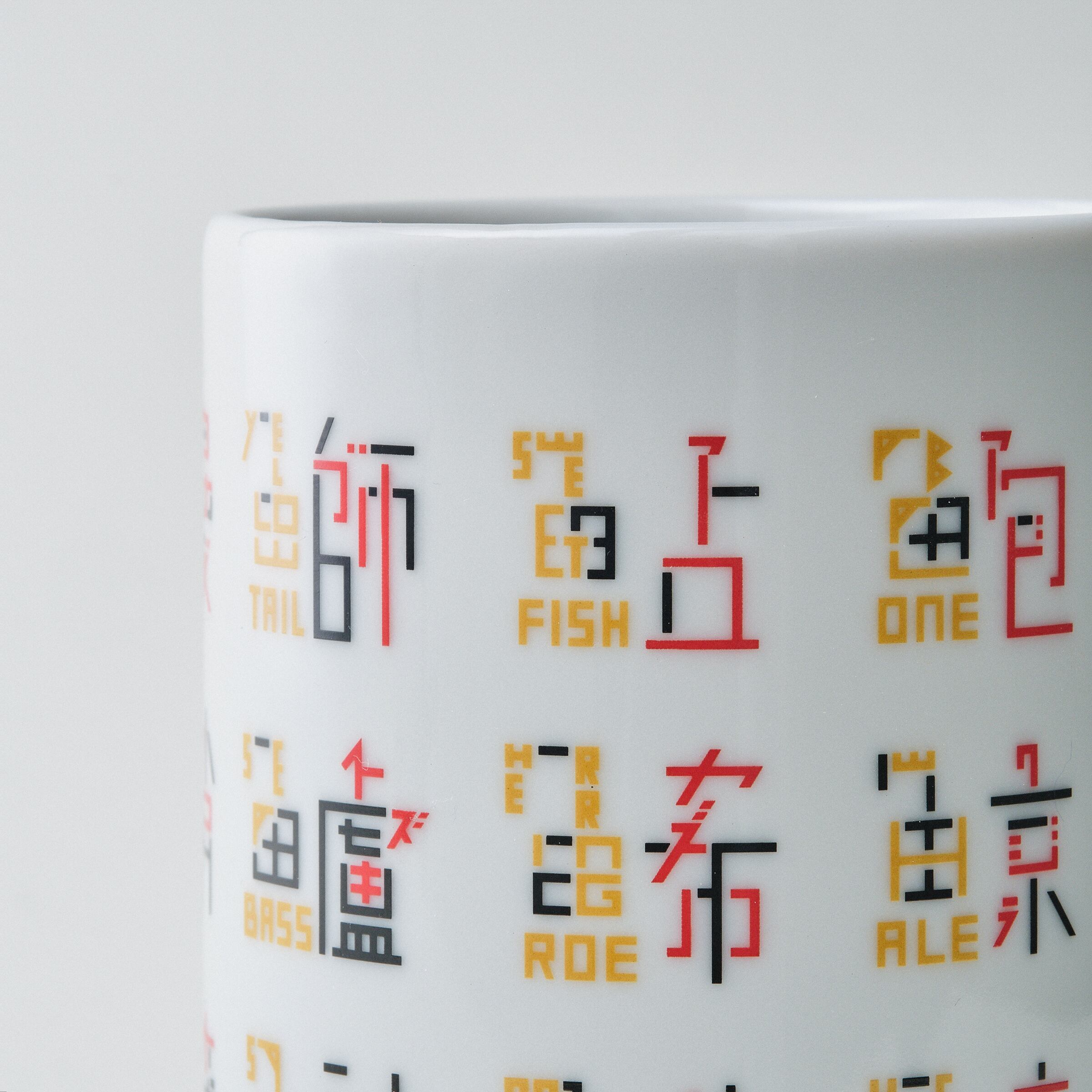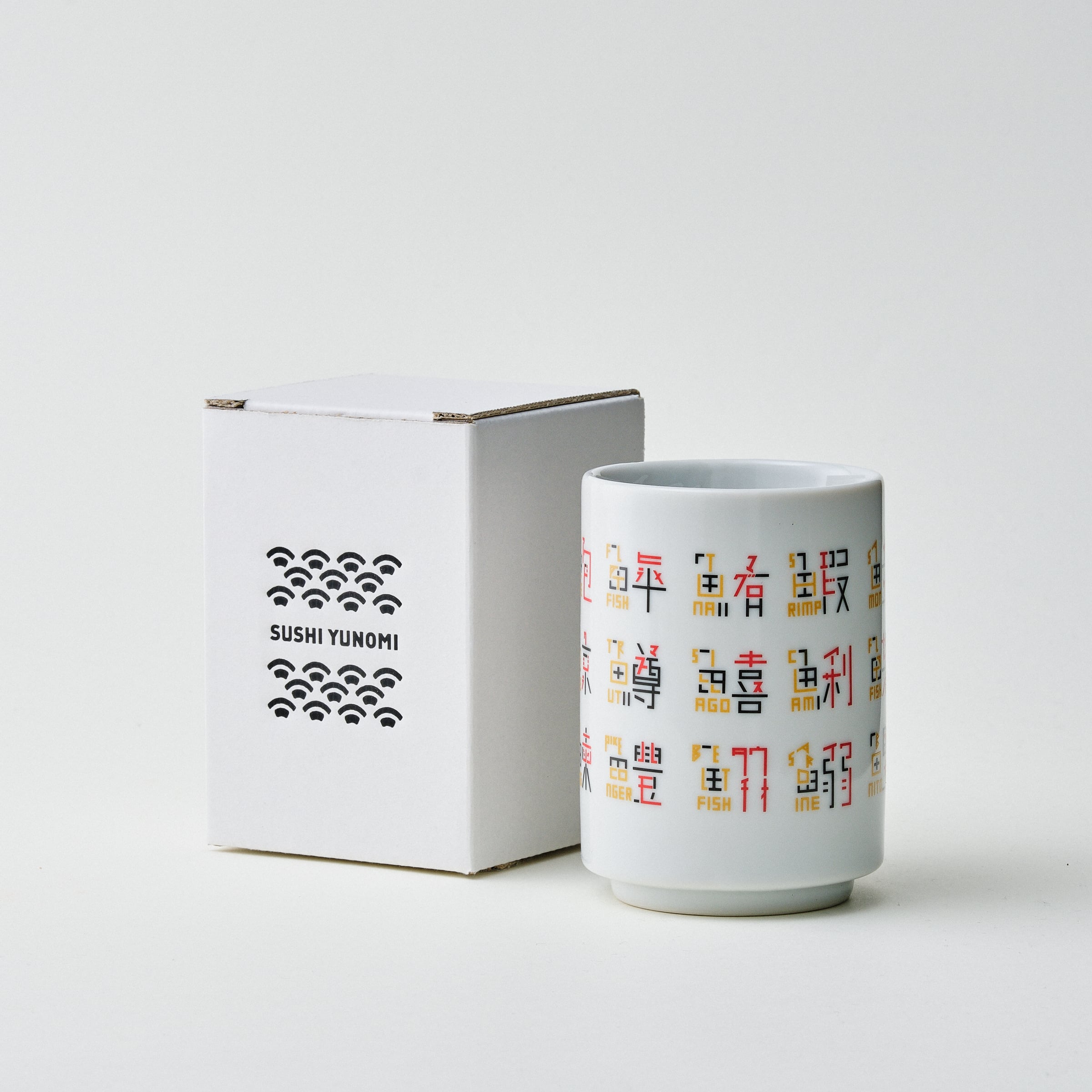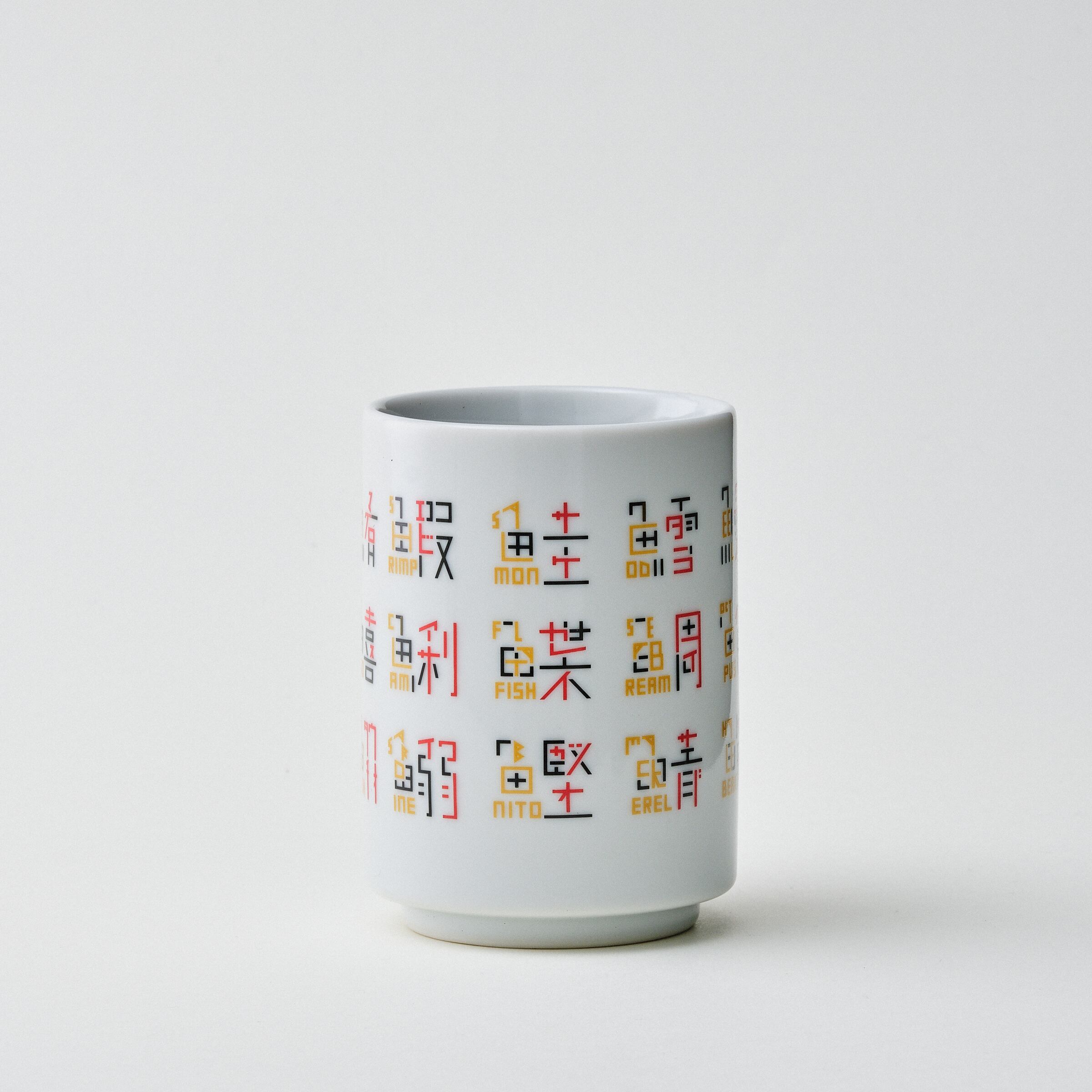 魚の漢字の中に、英語とカタカナ読みがかくれている湯呑みです。